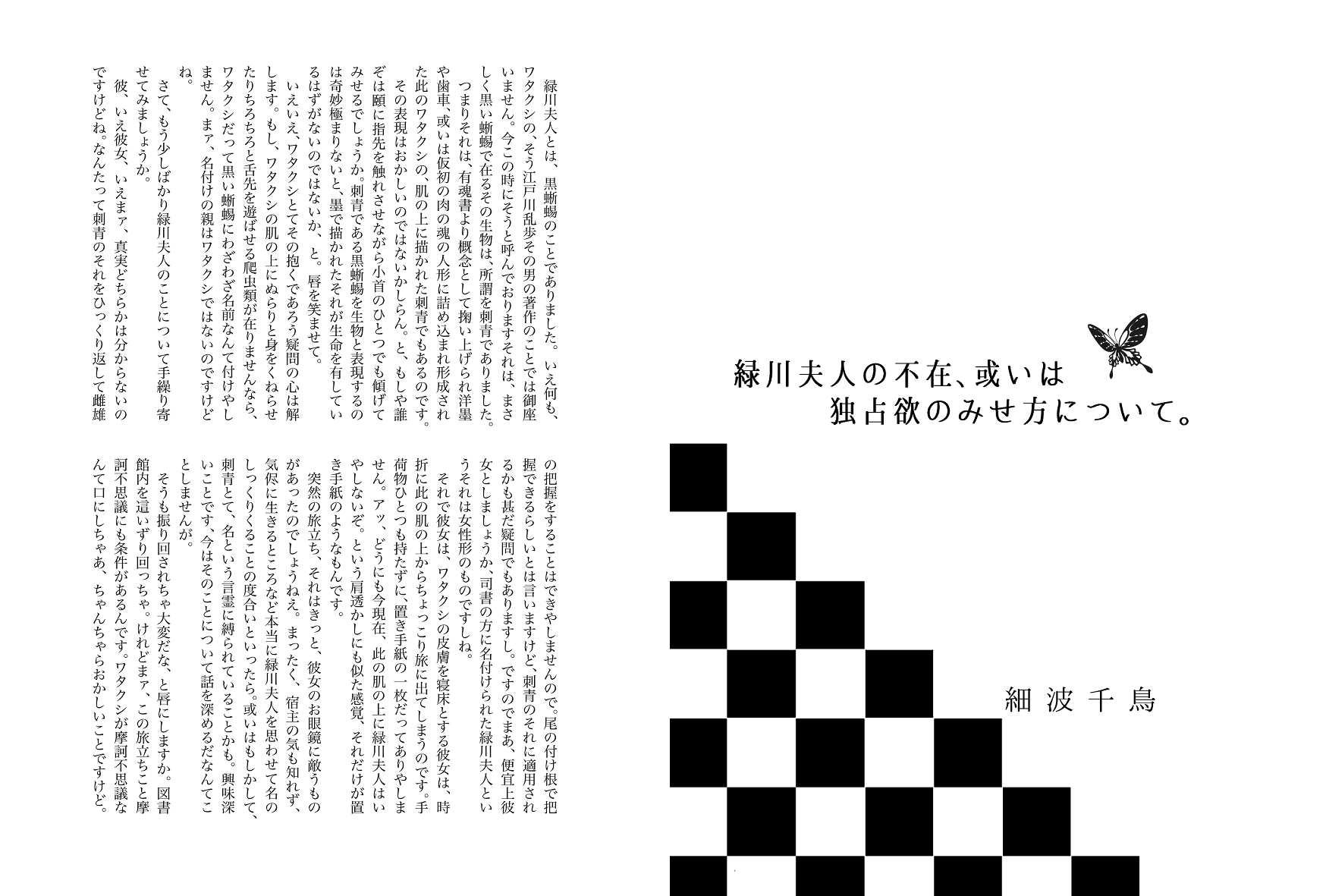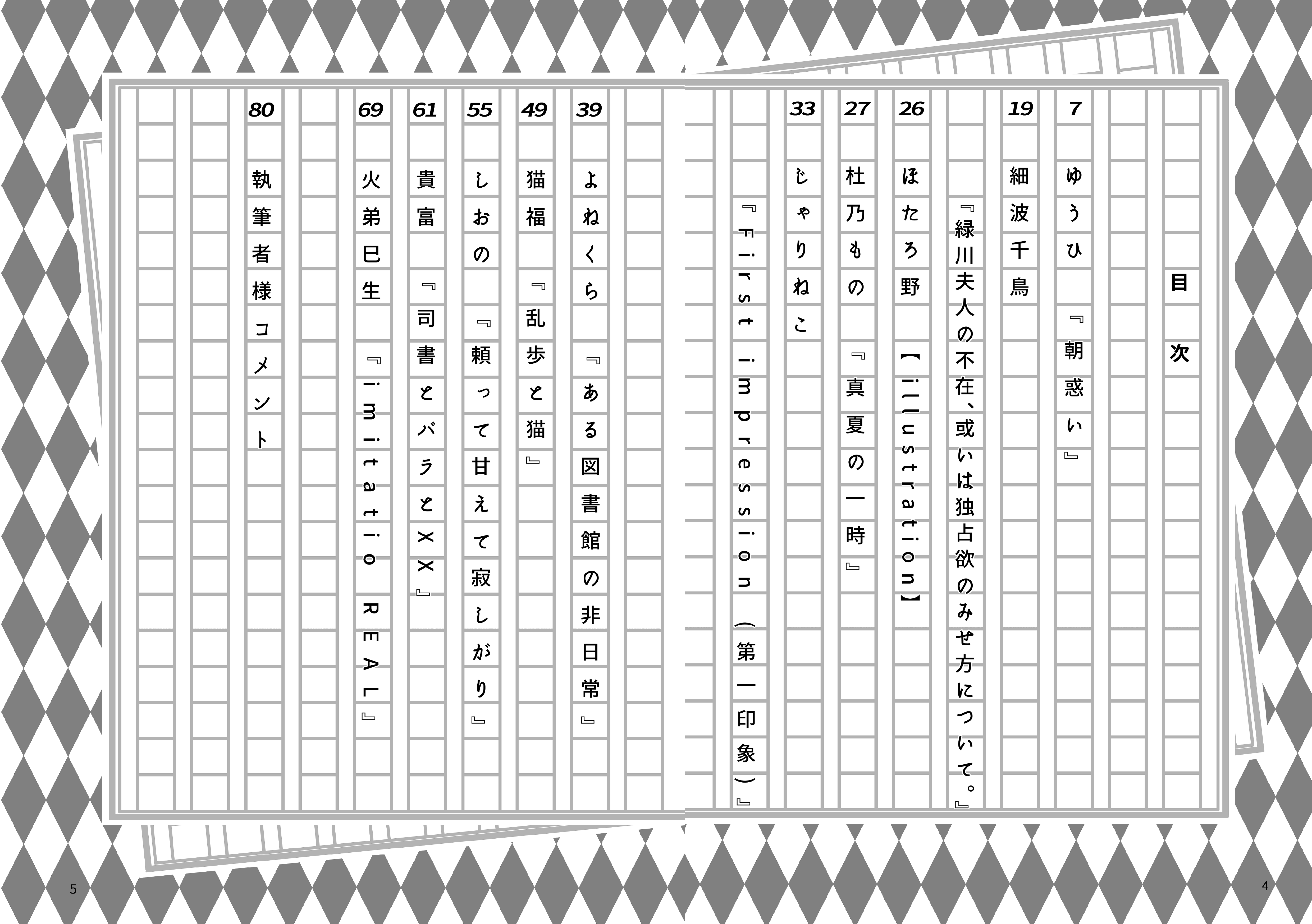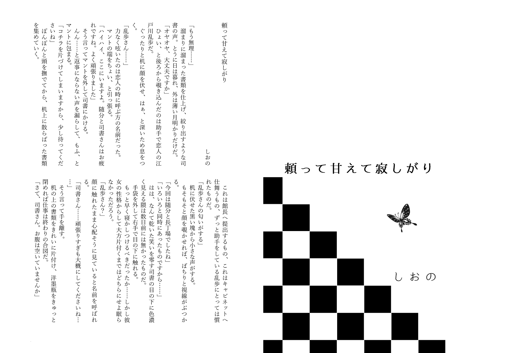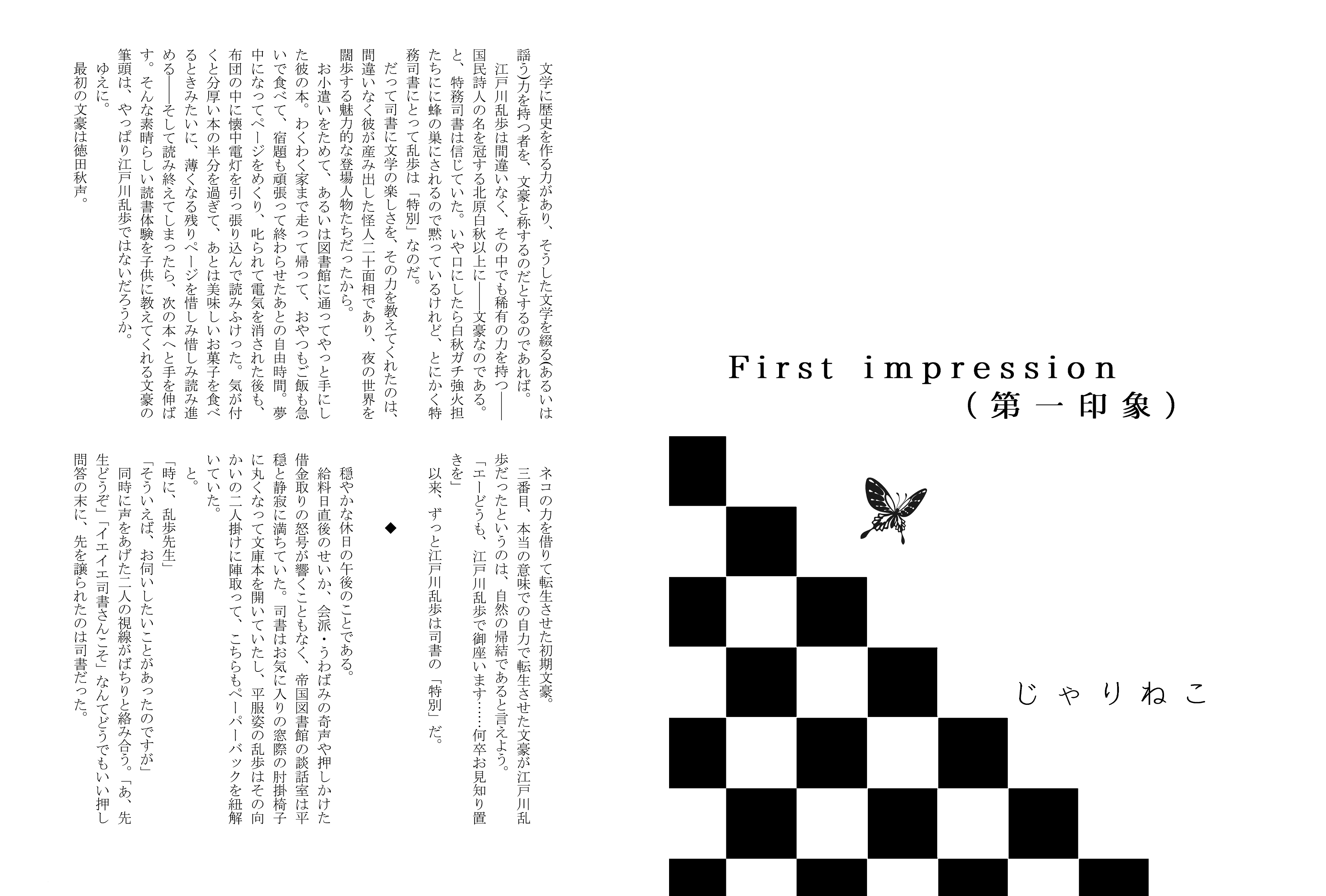 乱司書アンソロジー「LOVE&trick」 【文豪とアルケミスト】 2021年09月17日 江戸川乱歩×創作女司書アンソロジー(全年齢向け 漫画・小説・イラスト)【皆様の図書館での乱歩先生と司書さんのおはなしを見せてください!】をテーマに執筆者様方それぞれの図書館の乱司書を詰めました。 ※司書の設定や名前などは有無も含めて執筆者様によって異なります【執筆者様 敬称略】細波千鳥・しおの・じゃりねこ・貴富・猫福・ほたろ野・杜乃もの・ゆうひ・よねくら・火弟巳生(主催) 【A5/88p/¥800】〈pixivのサンプル〉■BOOTHで買う■b-2FOLIOで買う PR